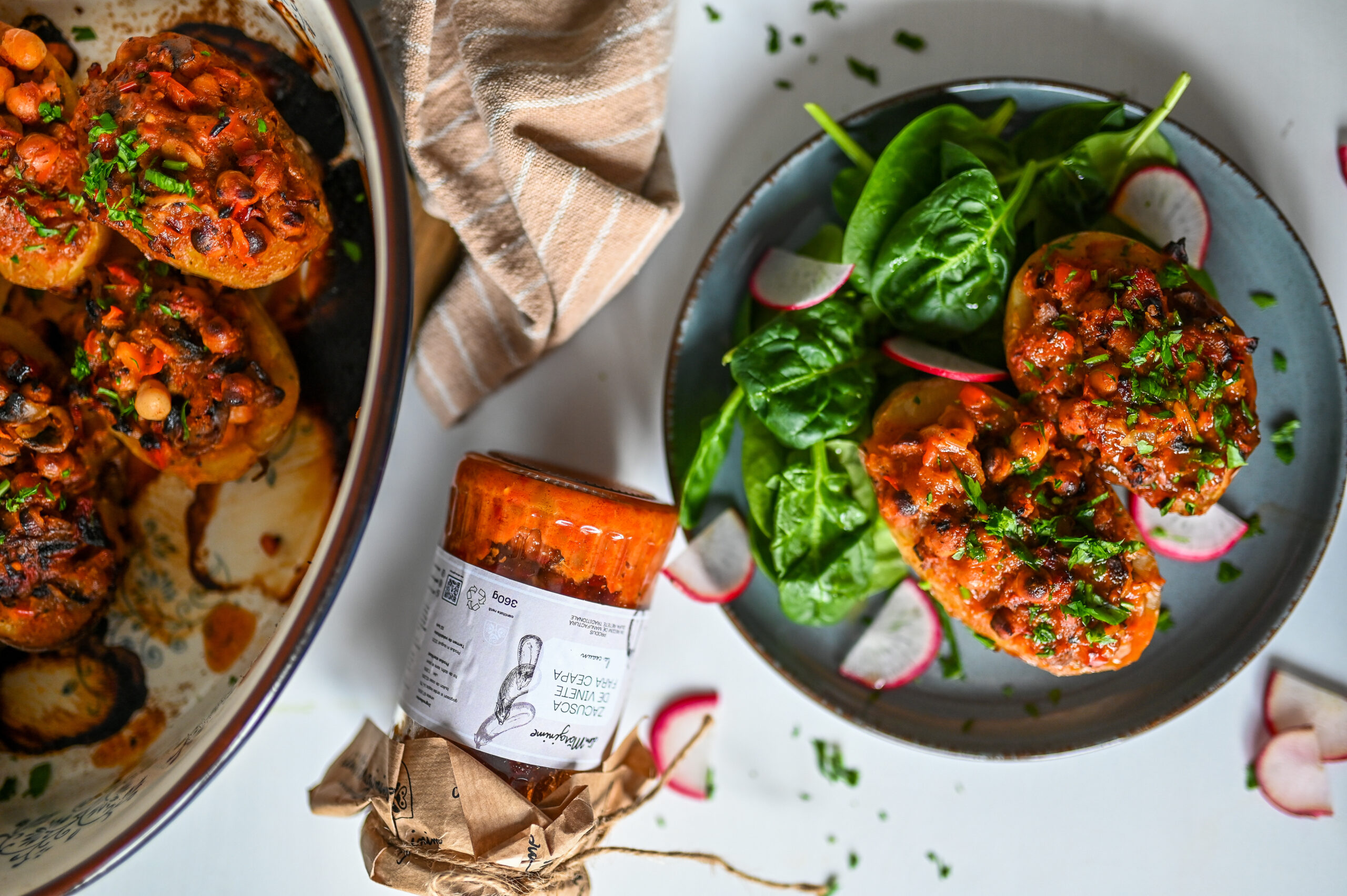Asta ne-am întrebat și noi, iar prietenul nostru, Dani, de la The Colors of Cooking ne-a răspuns: Cartof umplut cu mâncare de năut, ciuperci și zacuscă; pentru ca a manca local nu înseamnă a renunța la influențe.